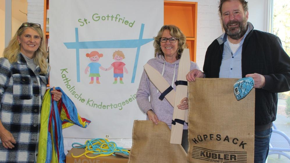 Manuela Zumdick (l.) und Petra Gerhardus von der Kita St. Gottfried freuen sich sehr über das "Bewegungs-Weihnachtsgeschenk" aus der Move-Kampagne, das Jochen Klosa überreichte.