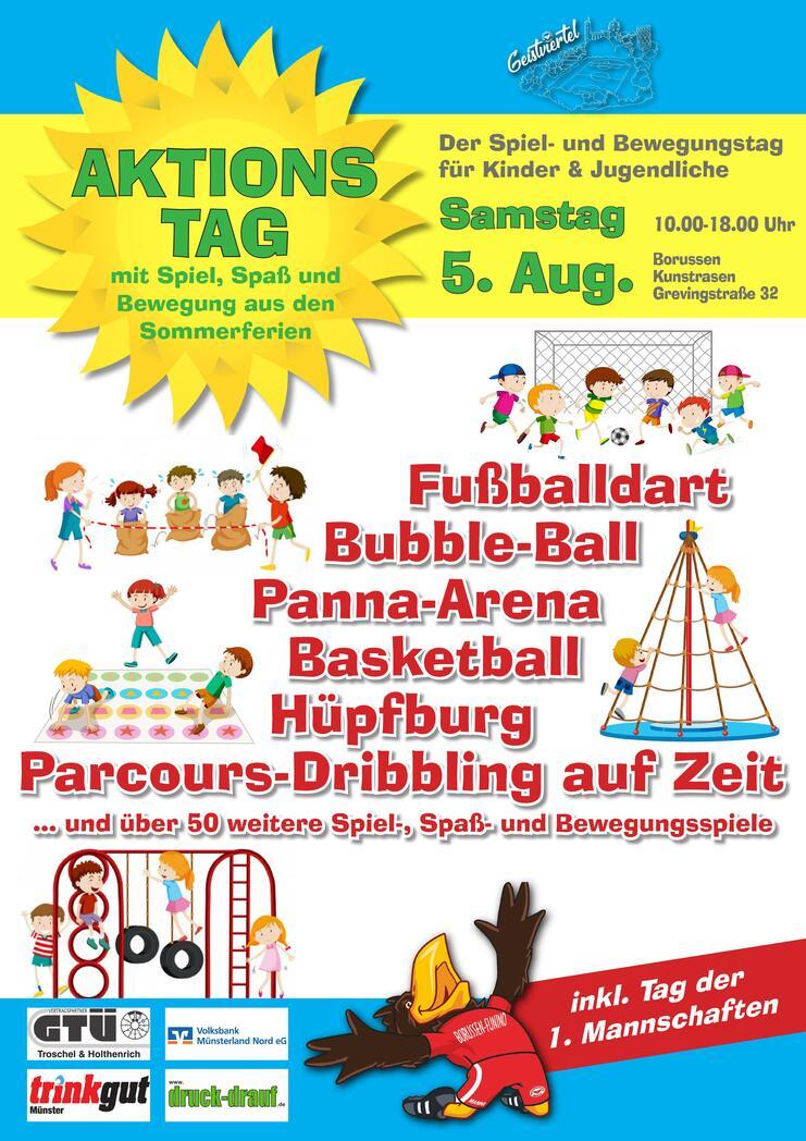 Mit dem Ziel, Kinder und Jugendliche mit Spiel und Spaß in die Bewegung zu bringen, organisieren wir unsere Aktionstage. Hier können und sollen sie sich bei den verschiedensten Angeboten austoben. So können auf der Sportanlage die vereinseigenen Spielattraktionen wie Bubbleball, Fußball-Dart, Hüfburgen, Spikeball, Disc-Golf, Blazepod, Parcours-Dribbling auf Zeit, Basketball uvm. ausprobiert werden, ebenso an den vielen Mitmach-Angeboten teilnehmen.