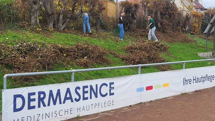 Bei bestem Herbstwetter wurden vor allem umfangreiche Grünflächenarbeiten durchgeführt. Mit Laubbläsern und Rechen rückten die Helferinnen und Helfer den herabgefallenen Blättern zu Leibe, Wege und Spielflächen sowie der Parkplatz wurden von Laub und Ästen befreit. Außerdem wurden Tornetze aufgebaut, Sträucher zurückgeschnitten und kleinere Instandsetzungsarbeiten erledigt, damit die Anlage auch in den kommenden Monaten für die Sporttreibenden in einem gepflegten Zustand bleibt.