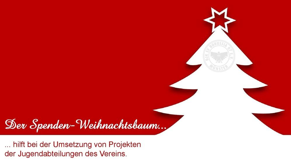 Die Aktion "Spenden-Weihnachtsbaum" wurde in der für alle nicht einfachen (Weihnachts-) Zeit zum 1. Advent ins Leben gerufen. Er soll dabei helfen, dass die vielen angedachten Projekte, wie z.B. der Borussen-Ferienpark, Fußball-Darts oder Riesenbausteine, der Jugendabteilungen des Vereins im Sinne der Kinder im Jahr 2021 umgesetzt werden können und auch gerade die vielen (jungen) Jugendtrainer/innen verlässlich unterstützt, indem sie weiterhin ihr Trainergeld erhalten.