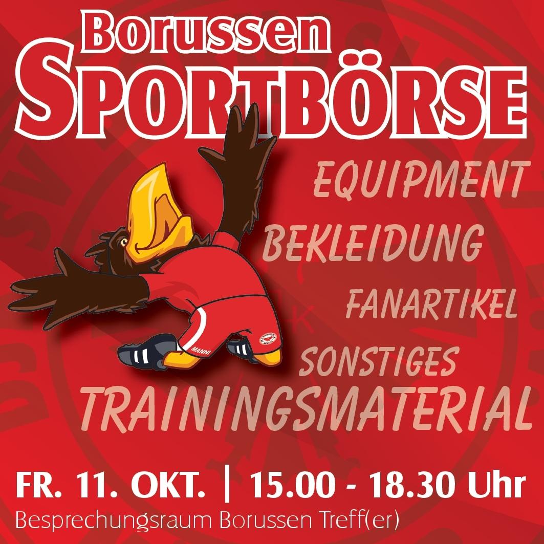 Bei unserer erstmalig stattfindenden Borussen-Sportbörse möchten wir euch die Möglichkeit bieten, vereinseigene Sportbekleidung die nicht mehr benötigt bzw. nicht mehr zum Einsatz kommen wird, kostengüstig zu kaufen. Hierbei handelt es sich um "alte" Trikots, Hosen, Stutzen aber auch z.T. um neuwertige Ausstattung wie Shirts, Hoodies, Trainings-Tops in unterschiedlichen Größen sowie um Equipment wie Taschen, Rucksäcke, Trinkflaschen etc., alles so lange der Vorrat reicht.