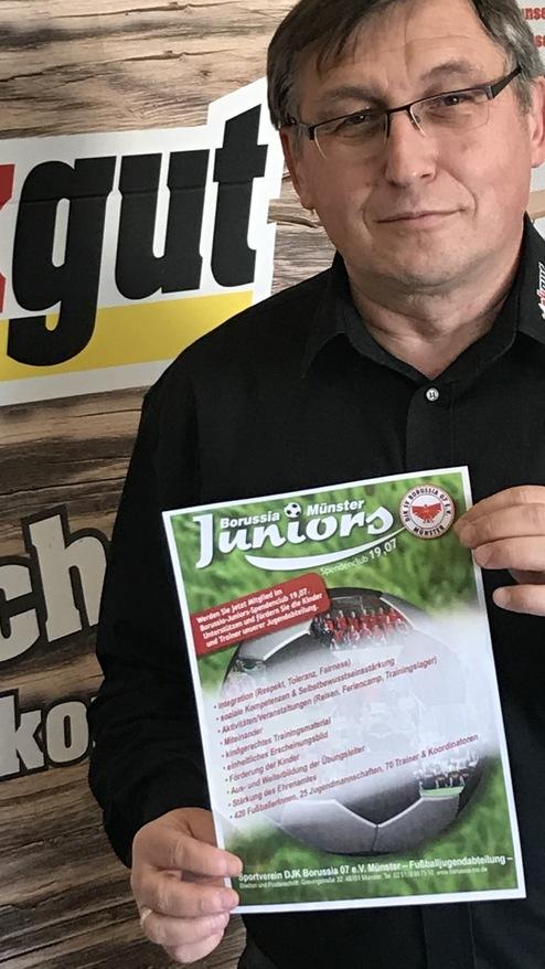 Neben ehemaligen und verdienten Borussen sowie zahlreichen Elternteilen engagieren sich mittlerweile auch viele Geschäftsleute im Borussen-Juniors Spendenclub 19,07, so auch unser lanjähriger Werbepartner Trinkgut Münster. Dem Förderer und Unterstützer der Borussen-Juniors Norbert Gorecki, Inhaber des Getränkefachmarkts, ist die Mitgliedschaft im Spendenclub ein besonderes Anliegen. Er möchte das gesellschaftlich so wichtige Ehrenamt unterstützen und aus seiner Sicht darf gerade die Förderung der vielen jungen und engagierten Jugendtrainer von Borussia Münster nicht unter der aktuellen Situation leiden. Tolle Einstellung.