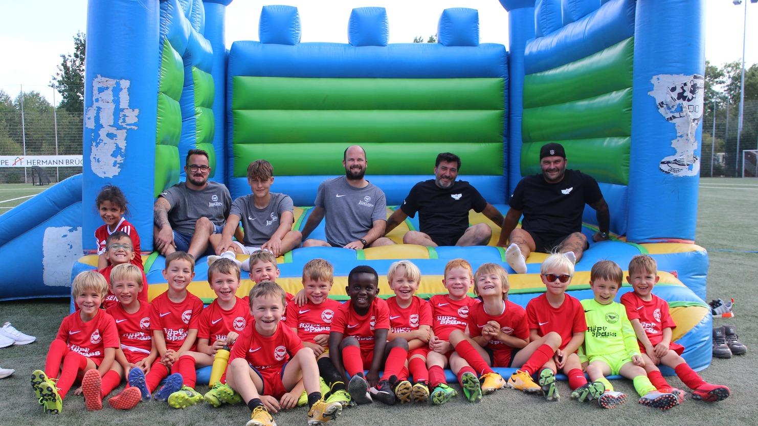 Die Borussen-Juniors der U7-1 freuen sich über die neuen Trikots und die besondere Übergabe durch das Team von Hüpfspass Münster