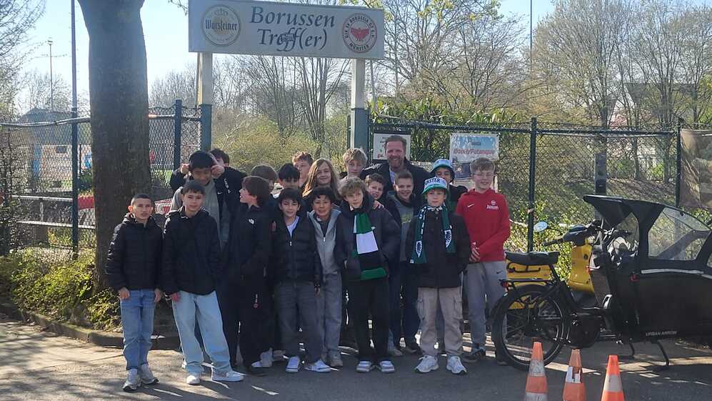 Die Freude über die Partnerschaft mit der Kulturkneipe Frauenstraße 24 ist bei dem Inhaber "Apo" (2.vl.) und den #borussenjuniors der U13-1 spürbar.