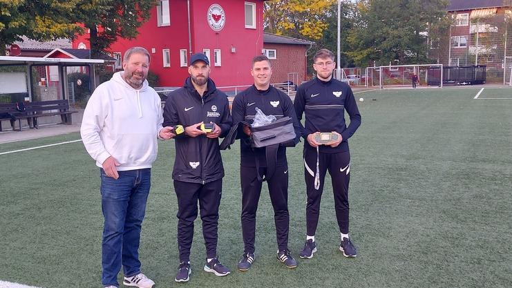 In der vergangenen Woche überreichte nun Jochen Klosa, Leiter Sport/Kommunikation des Vereins, symbolisch für alle Abteilungen des Vereins und deren TrainerInnen, an Henry Hupe und Thomas Klimka (1. Mannschaft) sowie an Henrik Wegener (U17-1), das neue Witty Lichtschranken-Zeitmesssystem.