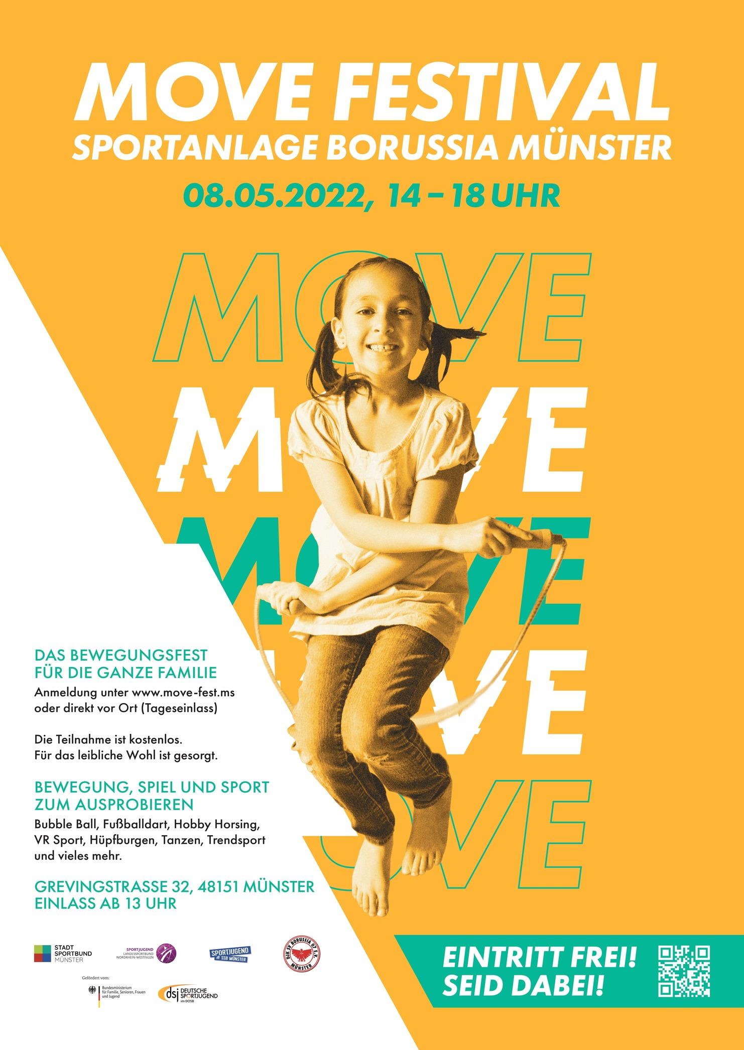 In Kooperationen mit der dsj, der Sportjugend NRW, dem Stadtsportbund Münster und der Sportjugend Münster veranstalten wir am 08. Mai eines von nur drei deutschlandweiten Move-Festivals. An diesem Aktionstag können sich Kinder und Jugendliche bei verschiedensten Angeboten austoben. Auf der Sportanlage können Spielattraktionen wie Bubbleball, Fußball-Dart, Hüfburgen oder Spikeball ausprobiert werden, ebenso wird es viele Mitmach-Angebote und ein abwechslungsreiches Rahmenprogramm für jung & alt geben. Für das leibliche Wohl während der Veranstaltung wird bestens gesorgt sein