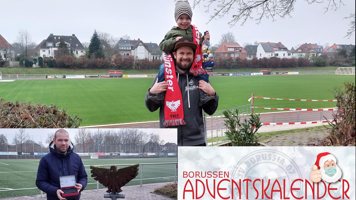 Nun sind weitere Preise aus dem Borussen-Adventskalender übergeben worden. So freute sich Förder- und Leistungstrainer der Fussball-Jugendabteilung, Dennis Schunke, mit seinem Sohn Enno, der in der Ballgewöhnung der Borussen-Juniors spielt, über den neuen Borussen-Schal.