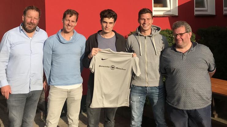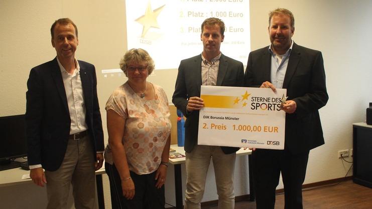 Der Sportliche Berater der Jugendabteilung Marc Kuhlmann und Jugendobmann Jochen Klosa (3. und 4. v.l.) konnten beim vierten regionalen Entscheid „Sterne des Sports“, eine Aktion des Deutschen Olympischen Sportbundes (DOSB) und der Volksbanken, aus den Händen von Astrid Markmann, stellv. Vorsitzende des SSB Münster, und Friedhelm Beuse, Vorstand der Vereinigte Volksbank Münster, einen Scheck über 1.000,- Euro entgegennehmen. Erfolgreich beworben haben sich die #borussenjuniors mit dem Projekt „#FUNino- Straßenfußball ohne Beton und Asphalt“.