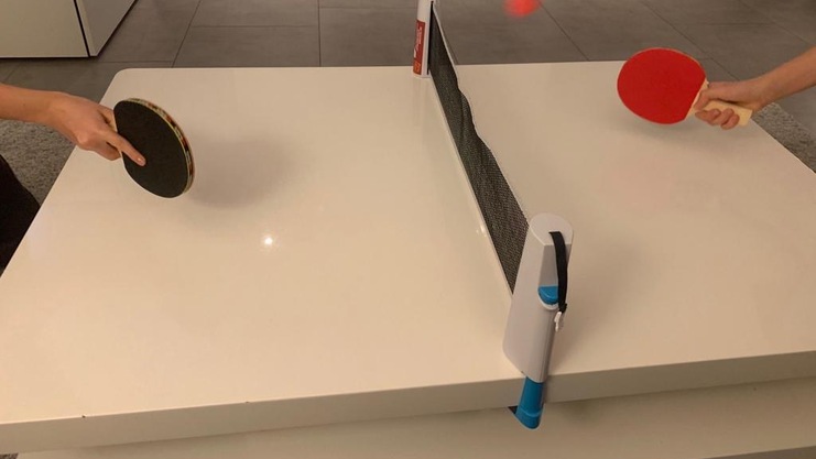 - ein Tischtennisnetz, das ihr flexibel für den Wohnzimmer-, Küchen- oder Gartentisch nutzen könnt