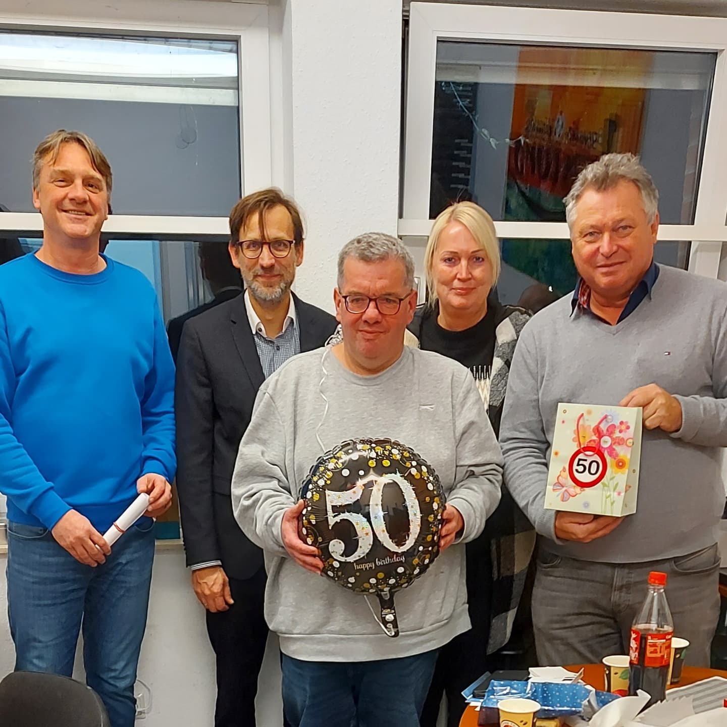 Zum 50. Geburtstag wurde Alex heute vom Vorstand und Jugendvorstand an seinem Arbeitsplatz überrascht und entsprechend beschenkt.
