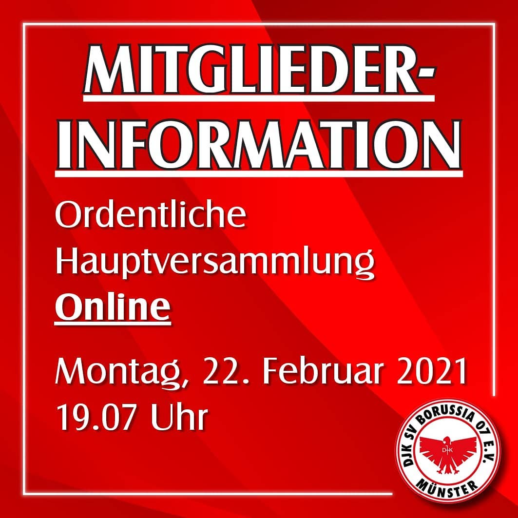 Alle Mitglieder sind zur ordentlichen Hauptversammlung per E-Mail und Post eingeladen worden. Da die gewohnte Präsenzveranstaltung - aus bekannten Gründen - nicht wie gewohnt im Borussen-Treff(er) stattfinden kann, wird die Versammlung erstmalig online durchgeführt. Die Veranstaltung findet am Montag, 22. Februar 2021, um 19:07 Uhr statt.
