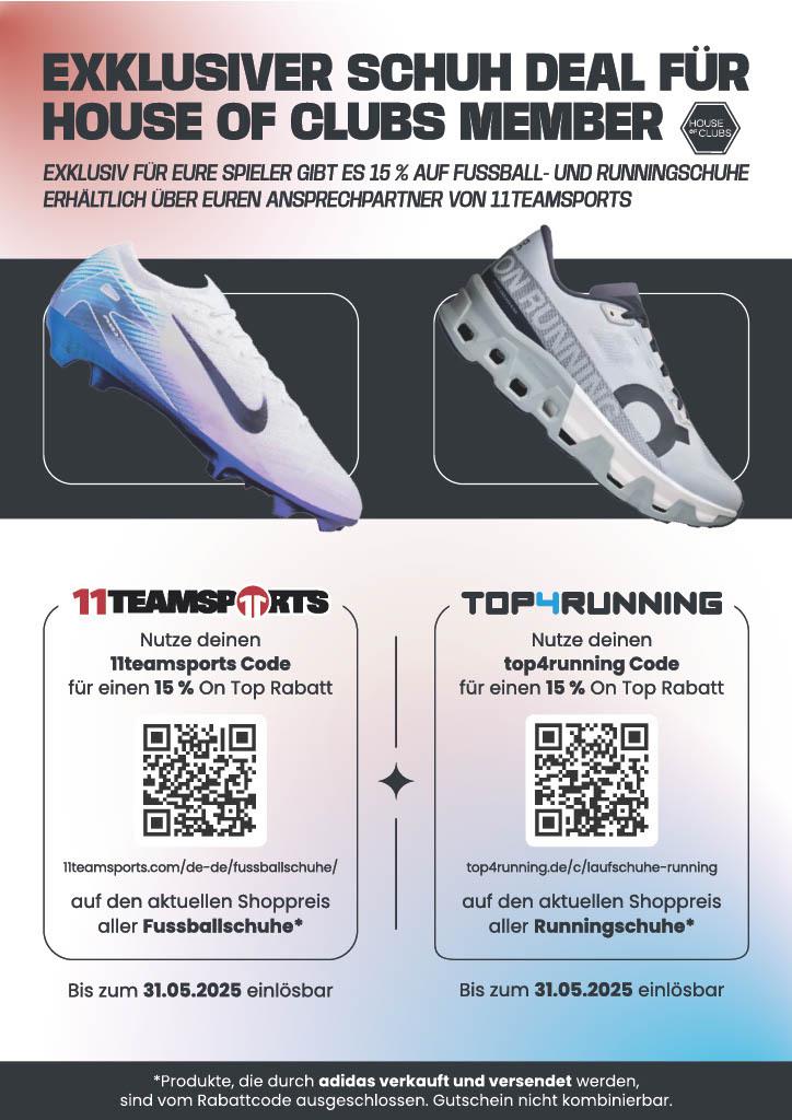 gemeinsam mit unserem Ausstattungspartner 11teamsports haben wir eine tolle Frühjahrsaktion für euch! Bis zum 31.05.2025 erhaltet ihr zusätzlich 15 % Rabatt auf die Shop-Preise für Fußball- und Runningschuhe. Weitere Informationen findet ihr im Flyer bzw. über den dort aufgeführten QR-Code.