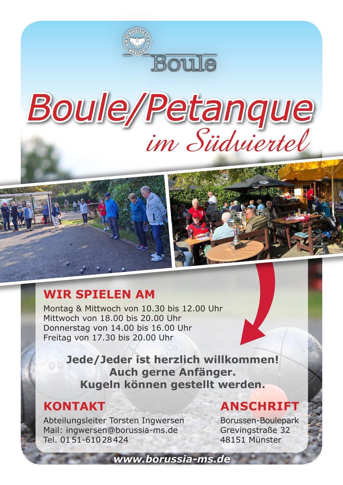 P.S.: Wer Interesse am Boulesport bei Borussia hat, kann gern zu den Trainingszeiten einfach mal unverbindlich dazukommen.