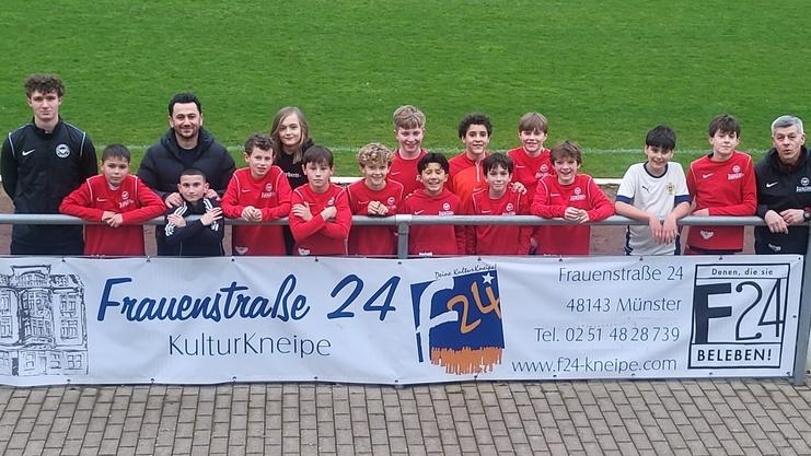 Die Freude über die Partnerschaft mit der Kulturkneipe Frauenstraße 24 ist bei dem Inhaber "Apo" (2.vl.) und den #borussenjuniors der U13-1 spürbar.