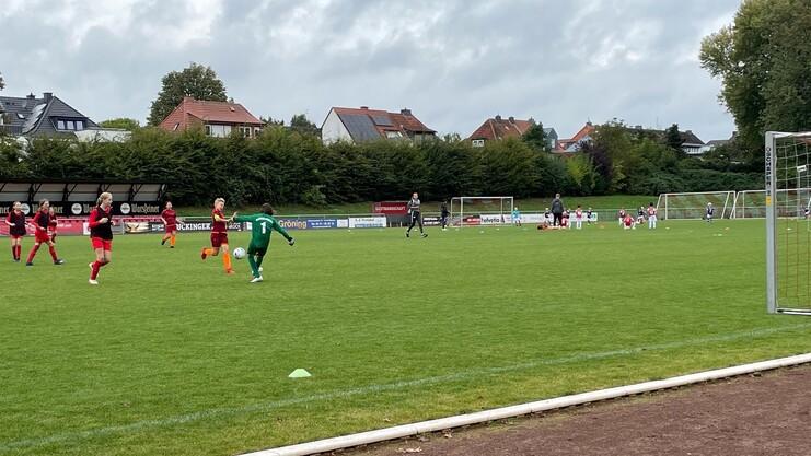 Bei sonnigem Herbstwetter galt es, die guten Eindrücke der Vorwochen gegen einen Gegner zu bestätigen, der bereits Kinderhaus besiegt hatte und daher nicht zu unterschätzen war. Kurz vor dem Anpfiff musste noch ein neuer Schiedsrichter organisiert werden. Glücklicherweise hatte Andre (Trainer der U 17) Zeit einzuspringen. Vielen Dank dafür. Vom Anpfiff an konnte sich die Mannschaft ein klares kämpferisches und spielerisches Übergewicht erarbeiten und die Gäste in deren Hälfte binden. Einige vielversprechende Chancen konnten aber nicht in Tore umgemünzt werden. Nach ca. 15 Minuten gönnte sich die Mannschaft eine kleine Pause und baute den Gegner damit auf. Mit einer starken Torhüterin und etwas Glück konnte diese Druckperiode aber ohne Gegentreffer überstanden werden. Danach drehte die Mannschaft wieder mehr, Anna-Lia übernahm wieder das Zepter im Mittelfeld und Hannah konnte sich einige Male in Szene setzen. Folgerichtig erzielte Hannah dann auch in der 32. Minute den überfälligen Führungstreffer zum 1:0. Mit dieser Führung ging es dann auch in die Pause.