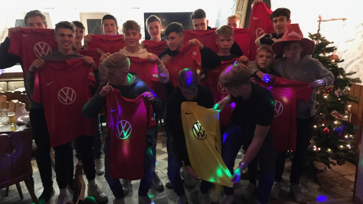 Das Trainer-Trio der U17-1 hatte am vergangenen Freitag alle Spieler und deren Eltern sowie die Verantwortlichen der Jugendabteilung und Unterstützer des Teams zur Nikolausfeier eingeladen. Nach der "offiziellen" Begrüßung durch die Trainer folgten dann ein paar Worte incl. kleiner Präsente der Abteilungsführung in Richtung Trainerteam und Mannschaft. Auch die Eltern hatten sich etwas besonderes einfallen lassen um den drei Coaches "Danke" für die tolle Arbeit zu sagen. So wurde ihnen ein nachgebautes Fußballfeld mit allen Porträts der Spieler, in Anlehnung an die Einladungskarte alle mit Nikolaus-Mütze, überreicht. Kurios, dass es nur Vorder- und keine Rückennummern gab und auch nur die Zahlen 5, 10, 20 und 50 aufgeführt waren.