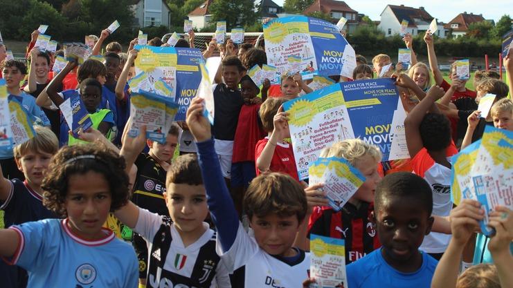 Wie man auf dem Bild gut erkennen kann, freuen sich die Borussen-Juniors darüber, dass am 01. Oktober ein weiteres Bewegungs-Event, der Move4peace-Aktionstag, auf unserer Sportanlange durchgeführt wird. Zu dem Familientag, der in der Zeit von 10.00 bis 18.00 Uhr stattfindet, laden die Kinder alle ihre Freunde, Klassenkameraden und insbesondere auch aus der Ukraine geflüchtete Kinder ein. Die Besucher, es werden wieder über 500 TeilnehmerInnen erwartet, können sich erneut an über 50 Spaß-, Bewegungs- und Mitmachspiele probieren sowie 4(!) Hüpfburgen und Spielattraktionen wie Bubble-Ball, Fußball-Dart und Panna-Arena nutzen.