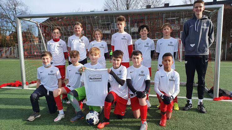 Dank der Unterstützung durch die Firma Reismann Trockenbau darf sich die U13-1 über neue Warmmach-Shirts freuen.