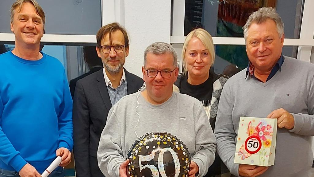 Sichtlicht überrascht ist Alex Budde über die Glückwünsche und Geschenke vom Vorstand und Jugendvorstand zu seinem 50. Geburtstag.
