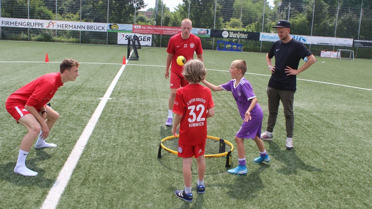 Heute bekamen die rund 150 Kinder im Borussen-Ferienpark Besuch vom Trainer-Team und von einigen Spielern der 1. Mannschaft. So stellten sich Yannick Bauer, Rene Aguiar, Henry Hupe, Hannes John und Moritz Pauli den Wettbewerben im Fußball-Dart, Messung der Torschußgeschwindigkeit oder in der Shoot-Out Area. Spielten Fußball-Billard, Spikeball mit den Teilnehmern*innen und nahmen am Bubble-Ball-Turnier teil. Ein absolutes Highlight für die Kids mit ihren "Idolen" von #borussiaeins die Spielattraktionen und Spielangebote zu nutzen.