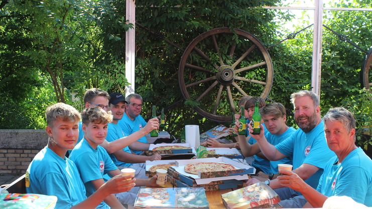 Nach dem Abbau am Freitag, dem Ende der 1. Woche im Borussen-Ferienpark, kamen die Teamer und Verantwortlichen der offenen Spaß- und Bewegungsfreizeit noch zu einer Nachbesprechung zusammen. In diesem Moment überraschte der Lieferdienst Yellowcab die Gruppe und spendierte ihnen zur Stärkung und als Belohnung für ihren Einsatz einige Familienpizzen. Großartige Aktion von Melanie und Amir.