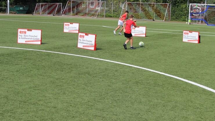 Sie lassen sich variabel in den Trainingsalltag einbeziehen und ergänzen somit die Möglichkeiten der Borussen-Trainer*innen. Auch bei der U15 um Trainer Thomas Klimka sind die Ballprallwände, die Dank des Sponsorings durch das GTÜ- und KFZ-Sachverständigenbüro Troschel & Holthenrich in Senden angeschafft wurde, bereits regelmäßig im Einsatz. Sie werden nicht nur als Spielpartner im Individualtraining genutzt, sondern dienen auch als Hindernisse, die umspielt werden müssen. Borussia spielt sich ein!