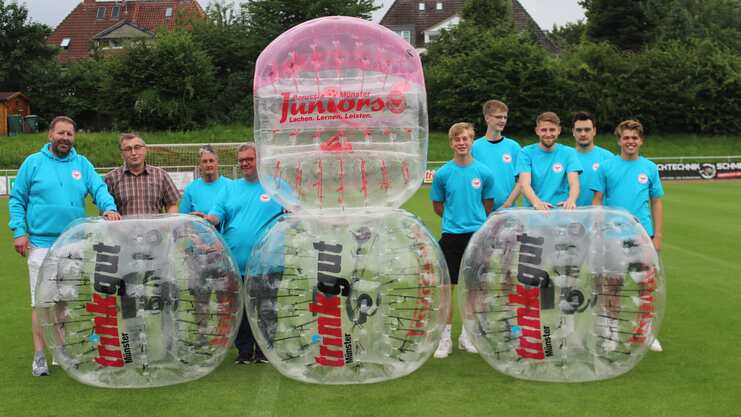 Münster's größter Getränke-Fachhändler und langjähriger Borussen-Juniors Partner, Trinkgut Münster, feiert in diesem Jahr sein 25-jähriges Bestehen. Hat sich Inhaber Norbert Gorecki zu seinen "Firmen-Geburtstagen" immer wieder kreative Aktionen einfallen lassen um Vereine und Institutionen in Münster zu unterstützen, hat er nun zum Jubiläum "mal so richtig einen rausgehauen". So hat er den Borussen-Juniors 12 (!) Bubble-Ball Bälle für die Spaß- und Bewegungsfreizeit (19. bis 30. Juli) und für die weitere Nutzung aller Borussen-Mannschaften spendiert.