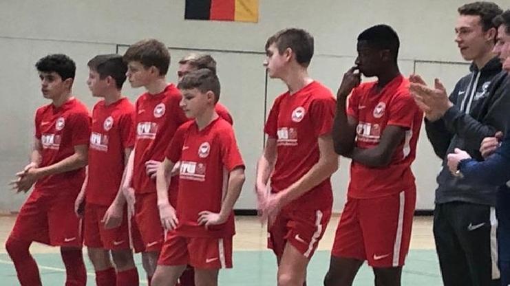 Der erste Gegner ist Teutonia. Gespielt wird fünf gegen fünf und einmal zehn Minuten. 3 Sekunden gespielt. Erster Abschluss von Paul. Nach einer Minute noch 0:0 nach drei Torschützen. Dann das 1:0 durch David. Eindeutiges Spiel. Traumpaar Julian, Tor von Leon. 2:0. Teutonia ohne Chance. 3:0 Leon. Vier Minuten gespielt. Jetzt etwas unkonzentrierter, aber dennoch vollkommen überlegen. Levin mit dem 4:0. Leon verhindert den Gegentreffer mit einem sehr gutem Defensivzweikampf. Die eigene Chancenverwertung ist noch ausbaufähig. Max macht das 5:0. noch zwei Minuten. David mit dem 6:0. Paul 7:0. Verdienter Sieg, aber eigentlich noch zu niedrig.