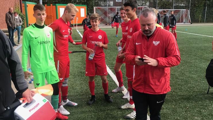 Die längste Reise. Ziel ist das Hamaland-Stadion der Spielvereinigung Vreden. Heute spielt der Tabellenvierte gegen den Tabellendritten. Der Sieger schiebt sich in jedem Fall um zumindest einen Platz nach vorn. Das hebt die Spannung. Treffen für unsere Mannschaft (Giacomo, Raphael, Leo, Ali, Lasse, David, Paul, Laura, Maddox, Julian, Gideon, Moritz, Benedikt, Levin, Leon) ist um 12:15 Uhr am Borussen. Anstoß ist um 15:00 Uhr. Ein langer Tag. Hannes und Arndt stehen am Rand. Henry muss heute passen. Er zittert aus der Ferne.