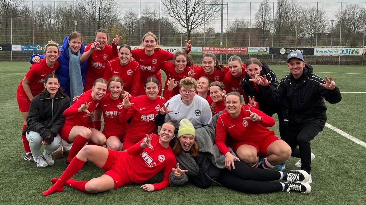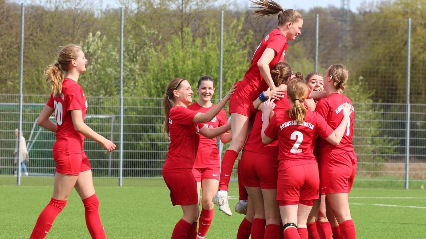 Die 1. Damen von Borussia schlagen Ibbenbüren, Kapitänin Kelly wird nach Traumtor unter Jubeltraube begraben