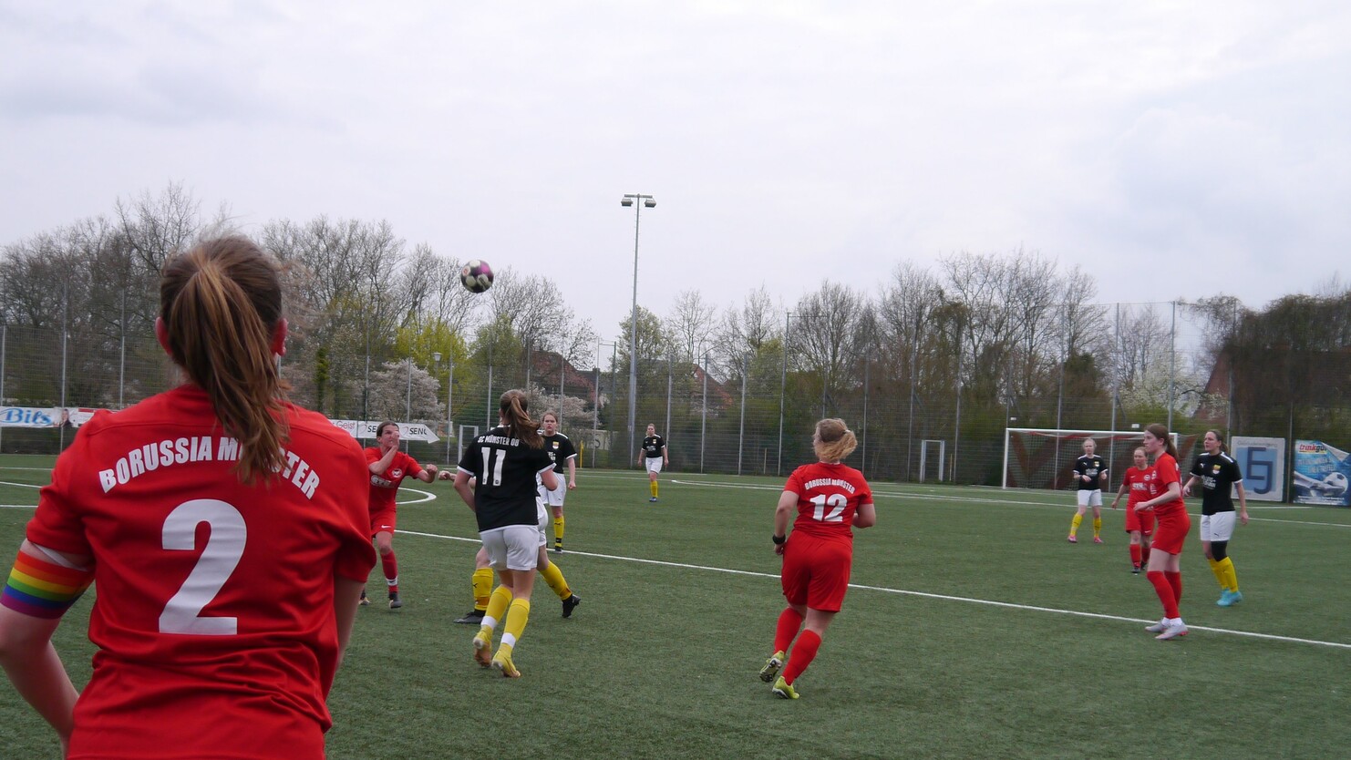 Nach dem Befreiungsschlag der letzten Woche, gingen die 2. Damen der Borussia am Sonntag hochmotiviert in das Spiel gegen den SC Münster 08. Mit einer vollen Bank und dem Debüt von Marie Rolvering wollte die Mannschaft dem Drittplatzierten vor heimischem Publikum die Stirn bieten und keinesfalls wertvolle Punkte hergeben. So lautete die Divise zunächst defensiv zu stehen, um dem Gegner die Räume zum Tor zu verschließen. Trotz der Bemühungen konnte Münster 08 in der 19. Spielminute in Führung gehen. Auch ein paar torgefährliche Standardsituationen durch die Borussia änderten nichts an diesem Torstand und so nahmen die Gäste den Vorsprung mit in die Halbzeitpause. Da es für die Borussia Damen nun um alles oder nichts ging, spielte die Mannschaft in der zweiten Halbzeit mit deutlich mehr Risiko. So konnten die Gäste in der 51. Minute ihren Vorsprung weiter ausbauen. Doch die Damen der Borussia gaben das Spiel noch nicht auf. Der Wille war da und getragen von den Fans gelangen einige schöne Aktionen, die jedoch ohne Torerfolg blieben. Anders verhielt es sich bei den Gästen des SC Münster 08, die immer wieder ihre Chancen nutzten und die Führung Tor um Tor weiter ausbauten. Schließlich musste sich die Borussia mit einem 0:6 geschlagen geben.