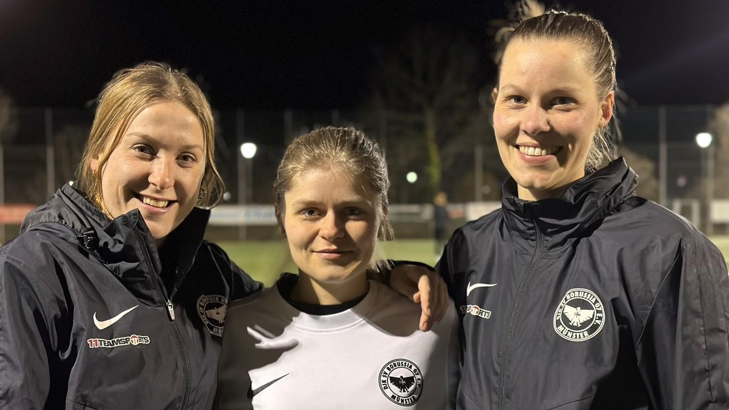 Unsere 2. Damenmannschaft läutete mit neuer Cheftrainerin Emily Dieckhues (links) die Hallensaison ein. Dabei freute sich das Team nicht nur über die neuen Trikots, sondern auch über Verstärkung von Toya (Mitte) und Jana (rechts) - herzlich willkommen bei Borussia!