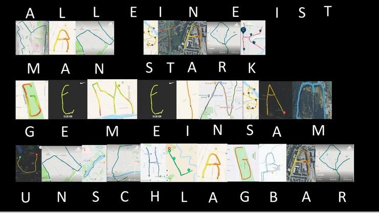 Am Sonntag, den 03.01.2021 absolvierten die Spielerinnen und Trainer der 1. Damen und 2. Damen von Borussia Münster einen Neujahrslauf – und der verlief mal ganz anders als herkömmliche Neujahrsläufe. Jede Spielerin erhielt einen Buchstaben, den es in Münster zu erlaufen galt. Es wurden Routen herausgesucht, Strecken bemessen und dann wurde um Punkt 11 Uhr per WhatsApp-Nachricht der Startschuss gegeben. Obwohl jede Spielerin den Lauf für sich alleine absolvierte, hatte die ganze Aktion einen immenses Gemeinschaftsgefühl. Jede Route musste erledigt werden, damit aus dem Buchstabensalat der Lösungssatz erlaufen werden konnte. Nachdem die Spielerinnen ihre Buchstabenroute in die WhatsApp-Gruppe geschickt hatte, begann das große Raten. Was könnte der Lösungssatz sein? Die Antwort lies nicht allzu lange auf sich warten und traf in der heutigen Zeit den Nagel auf den Kopf: